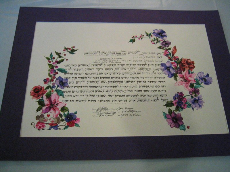 For my bridal shower, a friend of the family gave us a hand painted ketubah (you can see how personalized it actually is by the fact that (1) it's purple; and (2) it has a happy mousie couple in the bottom left corner!!! :). A ketubah is a marriage contract.