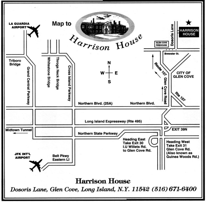 Exit 39N (Glen Cove Road) travel 5 1/4 miles north on Glen Cove Road to the fork in the road. Bear left and continue 1 1/2 miles to Brewster Street (Glen Cove Fire House will be directly in front of you). Make a right onto Brewster Street to the 4th traffic light (Dosoris Lane). Go left on Dosoris and continue one mile to Harrison House on the right.From the Northern State Parkway